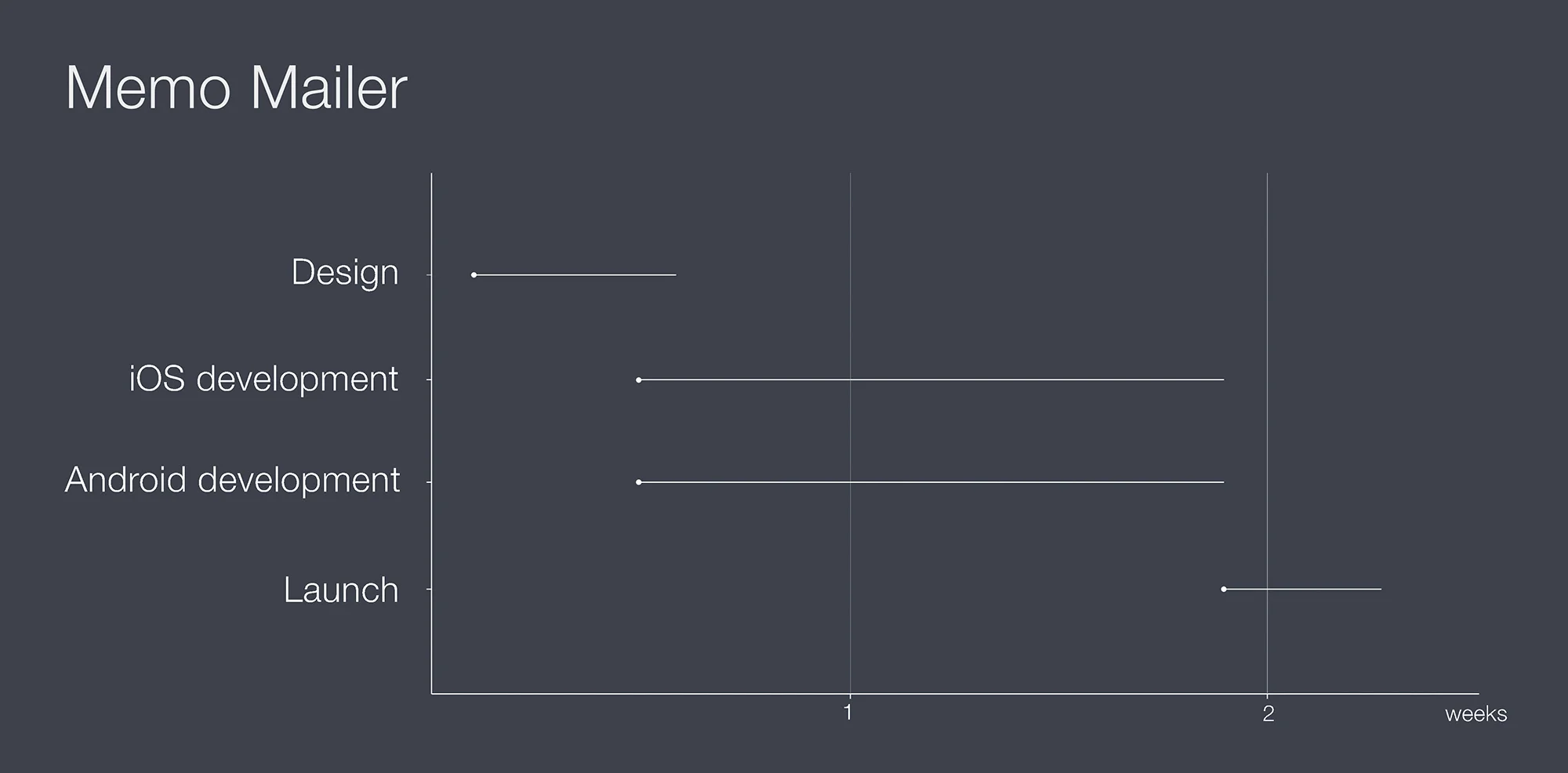 We could downgrade the development timeline on 20%, and as a result, it could be finished in 2 weeks including all design works and changes. The best way to present development process is “Gant’s charts”: